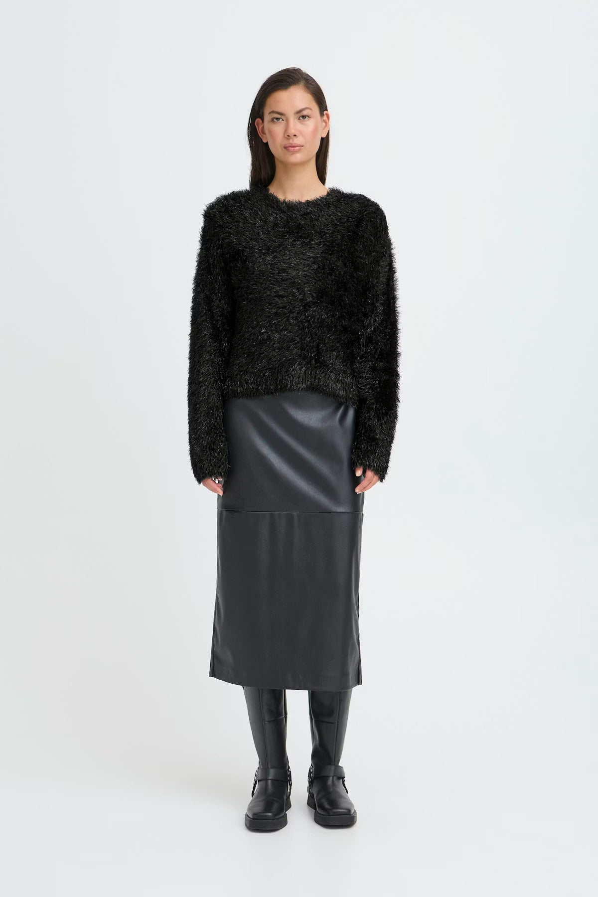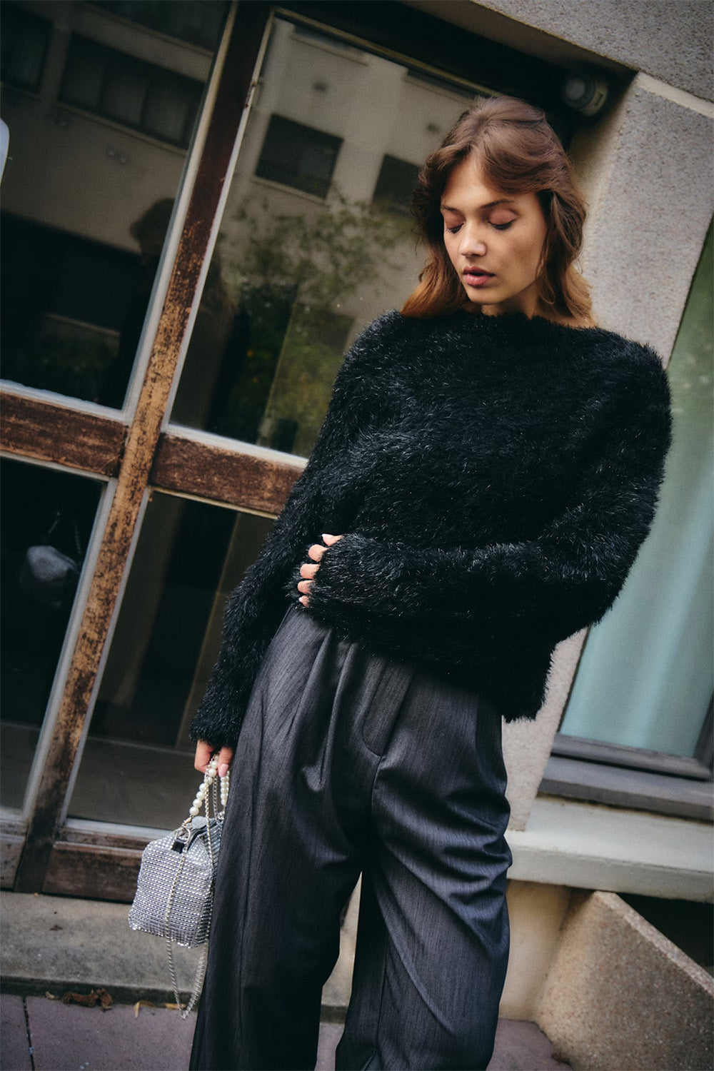 Fuzzy sweater with a plush, textured finish, featuring a classic crew neck and straight long sleeves. The cut is boxy and hip length for an effortlessly cool silhouette.