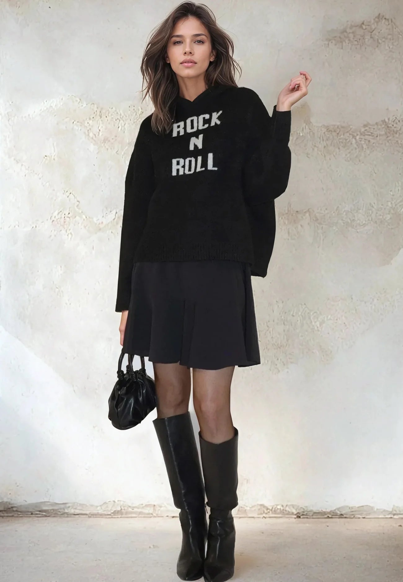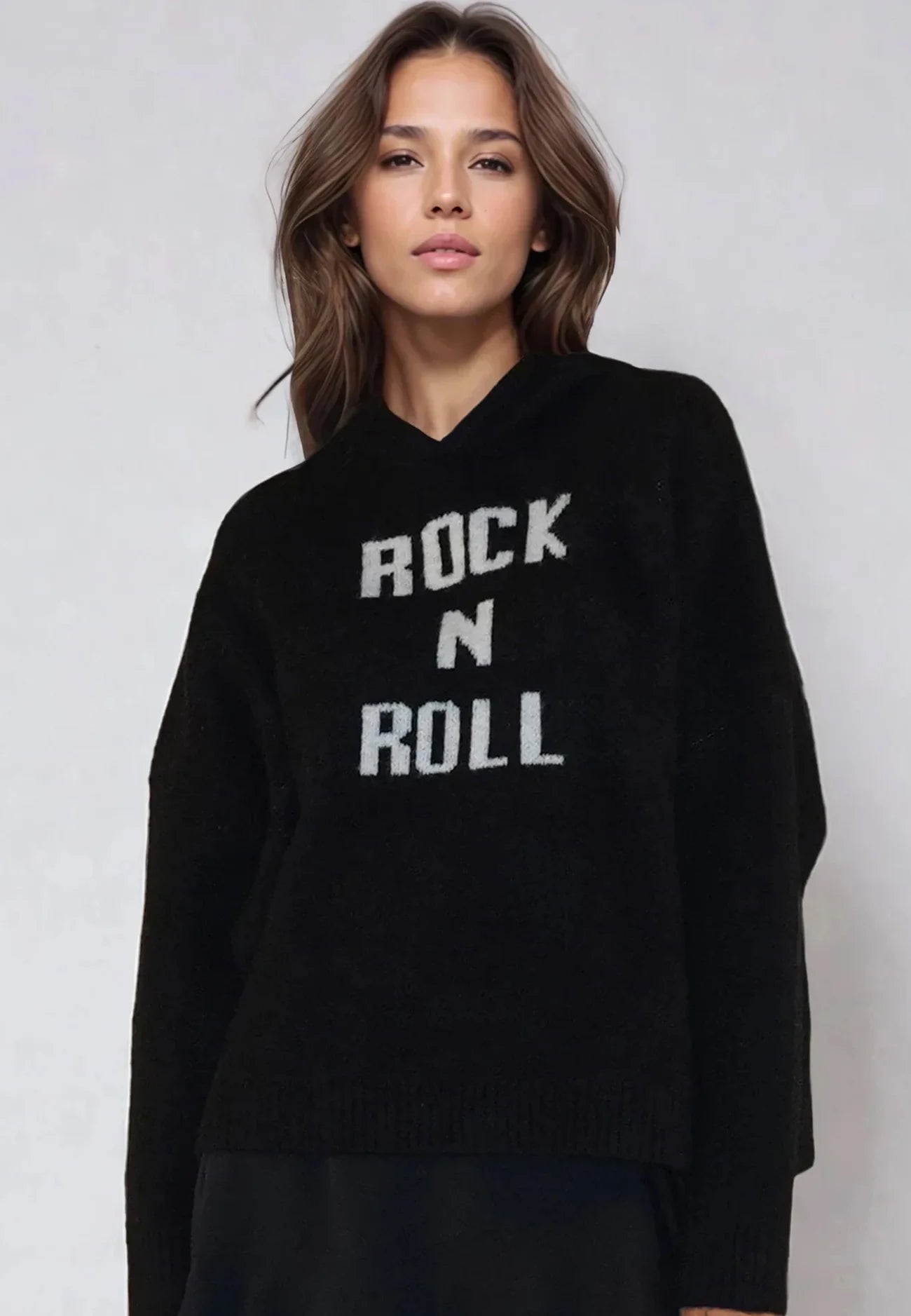 The Courtney Hoodie is a cozy yet stylish piece made from a soft wool mix knit. Featuring a hood and bold rock and roll slogan jacquard in black and white, this oversized hoodie offers long sleeves and a hip-length fit. Easy to wear and perfect for layering, it's ideal for pairing with jeans or casual trousers for a relaxed, fashionable look. The model wears a size UK 10. Length from the top: 57 cm